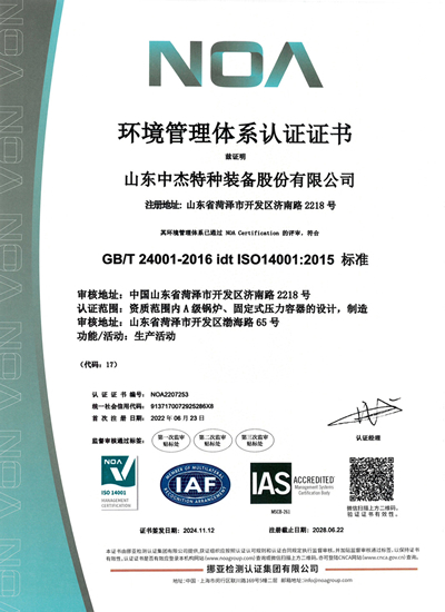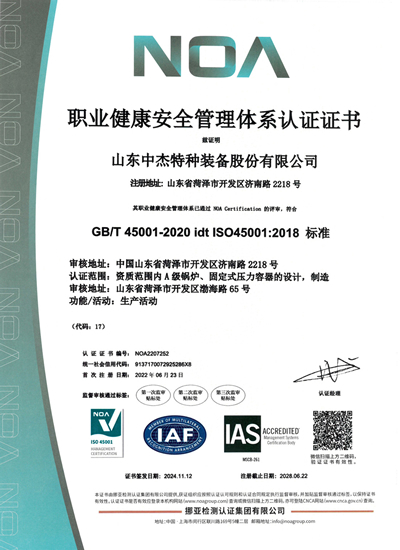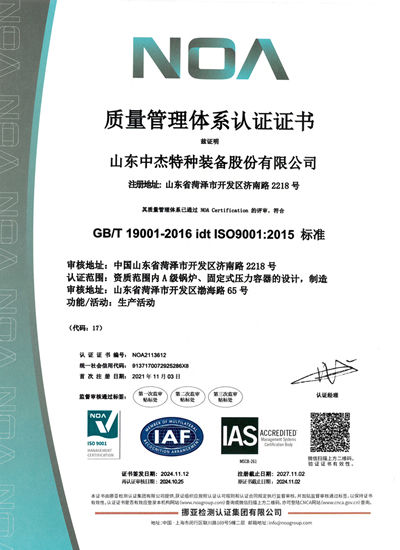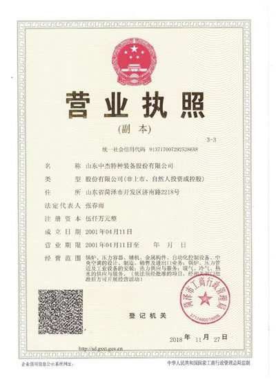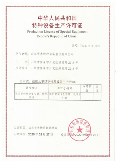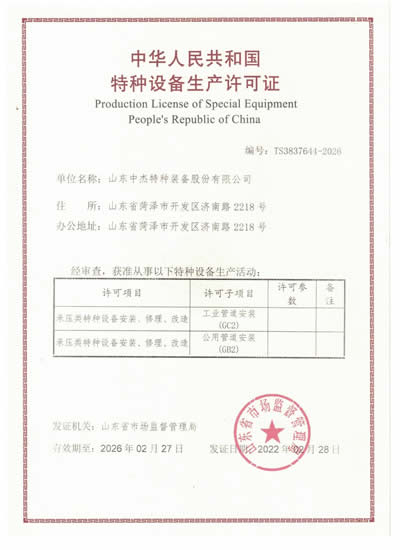 山东中杰特种装备股份有限公司(原菏泽锅炉厂有限公司)成立于1984年,公司先后被评为“高新技术企业”,“山东省专精特新企业”,“山东省瞪羚企业”,“山东省制造业单项冠军企业”,2022年8月被工信部认定为“国家专精特新小巨人企业”等荣誉。公司拥有自营进出口权,具有A级锅炉制造许可及A2级压力容器制造许可资质,A2级压力容器设计许可资质,B级锅炉安装和GB2类、GC2类压力管道安装许可资质及三级机电设备安装专业承包资质,是中国锅炉与水处理协会会员单位、中国化工装备协会会员单位和山东省装备制造协会理事单位,并通过了ISO9001质量管理体系、ISO14001环境管理体系、OHSAS18001职业健康安全管理体系认证和美国ASME/U2认证。