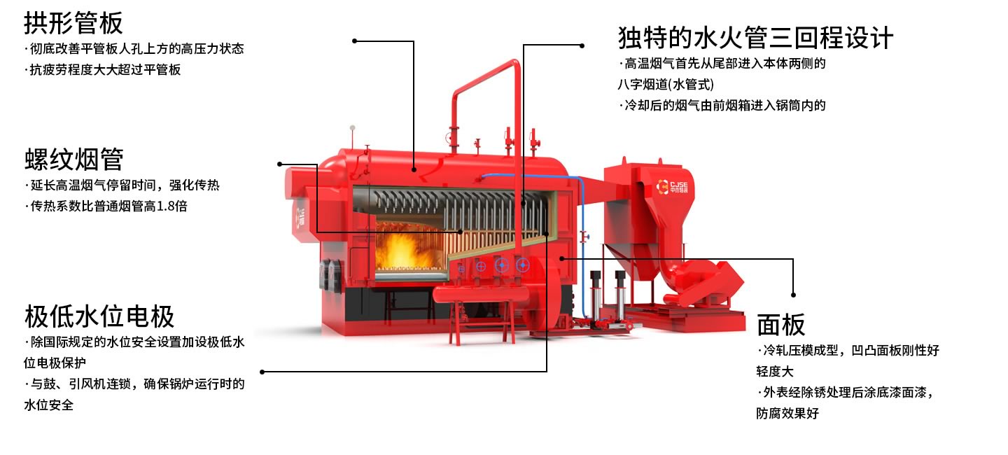 各规格锅炉热效率均>82%,高于国家标准要求。简化水循环回路后,减少了水循环流动阻力,提高了上升管内流速;对于热水锅炉在水循环流动阻力较大的左、右水冷壁加装回水引射装置。提高了水循环的可靠性,保证锅炉安全、稳定运行。 布置足够的受热面,使燃料燃烧放出的热量能够充分被受热面吸收后传递给工作介质,排烟温度低于160℃。合理布置前、后拱,提高炉膛温度的同时,加强烟气在高温区的扰动,减少了化学不完全燃烧损失和飞灰损失。